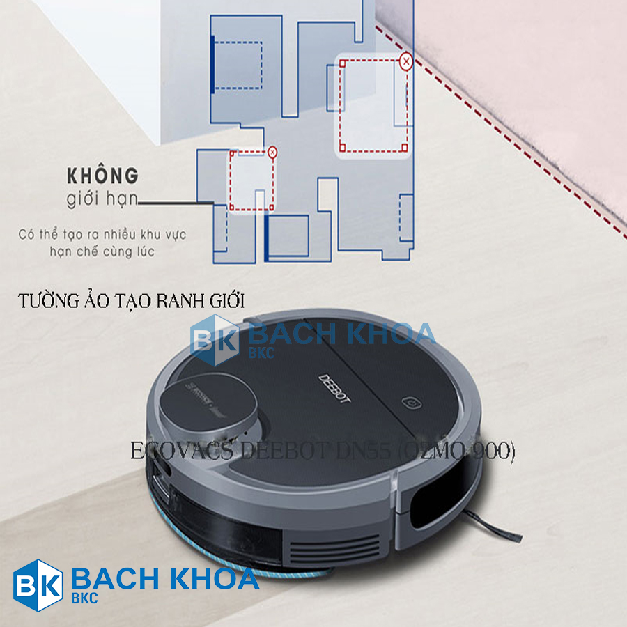 Ecovacs Deebot DN55 được trang bị tường ảo giúp khoanh vùng di chuyển làm sạch của Robot. Bạn chỉ cần đặt tường ảo ở vị trí không muốn Robot di chuyển tới, thiết bị sẽ phát tia hồng ngoại để tạo ranh giới không cho Robot vượt qua. Không chỉ một mà Deebot cho phép tạo nhiều tường ảo cùng lúc. Ngoài tường ảo, bạn cũng có thể sử dụng chế độ làm sạch khu vực để ưu tiên các khu vực nhất định.