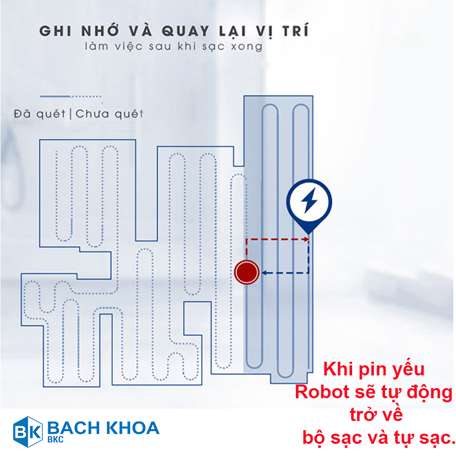 Với công nghệ thông minh, Deebot DN55 luôn tự xác định được khi sắp hết nhiên liệu để tự động trở về đế sạc. Sau khi sạc đầy, robot sẽ quay lại vị trí cũ để hoàn thiện công việc đang làm dở trước đó.