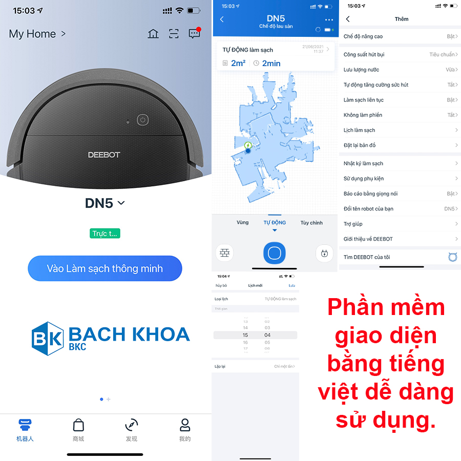 Bạn cài đặt ứng dụng điều khiển trên điện thoại di động và sau đó tiến hành kết nối với robot, bạn thiết lập chế độ làm việc cũng như mọi thao tác điều khiển một cách tiện lợi.