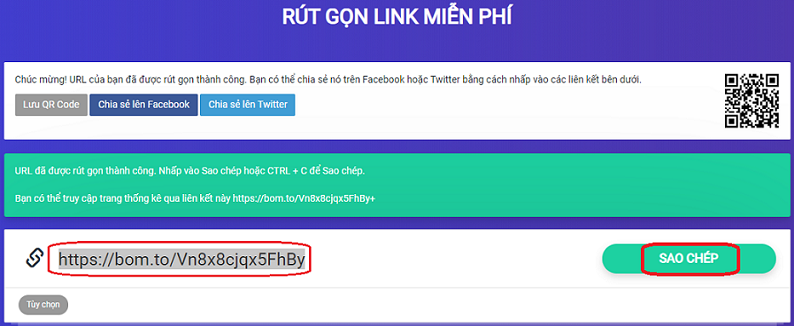 + Sau khi rút gọn link cho phép sao chép lưu QR code, chia sẻ lên Facebook và chia sẻ lên Twitter.