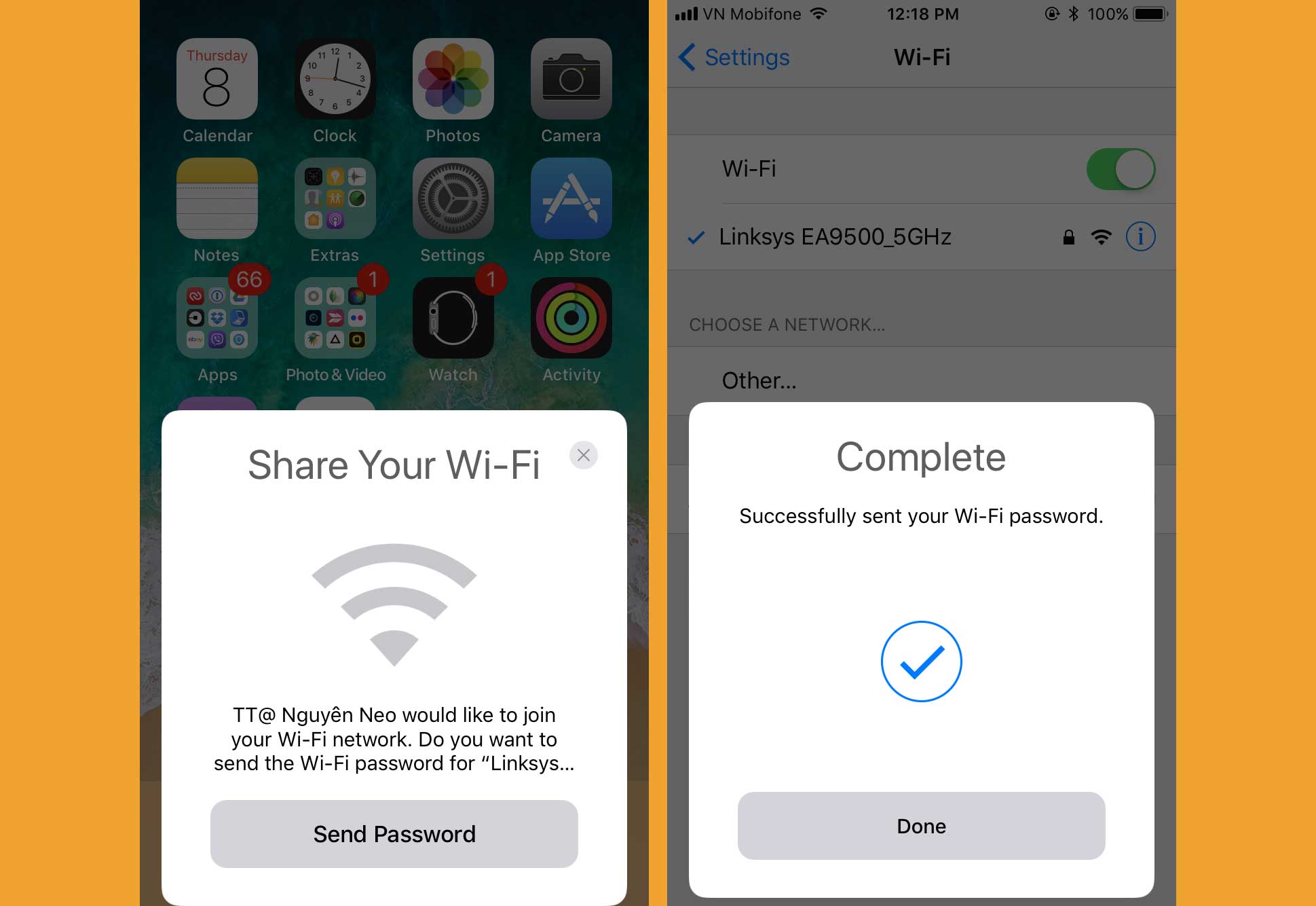 Bắt đầu từ bản cập nhật iOS 11, Apple đã bổ sung thêm tính năng cho phép người dùng chia sẻ nhanh kết nối WiFi cho người thân, bạn bè mà không cần cung cấp mật khẩu. Lưu ý, tính năng này chỉ hoạt động giữa các thiết bị iOS (iPhone, iPad) hoặc macOS và cả hai phải bật Bluetooth.