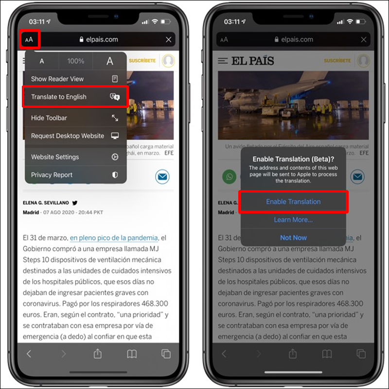 Trên iOS 14, trình duyệt Safari được tích hợp sẵn bộ dịch ngôn ngữ, có thể sử dụng để dịch trang web sang tiếng Anh, Tây Ban Nha, Trung, Pháp, Đức, Nga hoặc Bồ Đào Nha, nhờ có ứng dụng mới Translate mà Apple mới thêm vào. Bạn chỉ bấm vào biểu tượng aA trên thanh menu để tính năng dịch hiện ra. Bấm vào Translate và trang web sẽ tự động dịch.