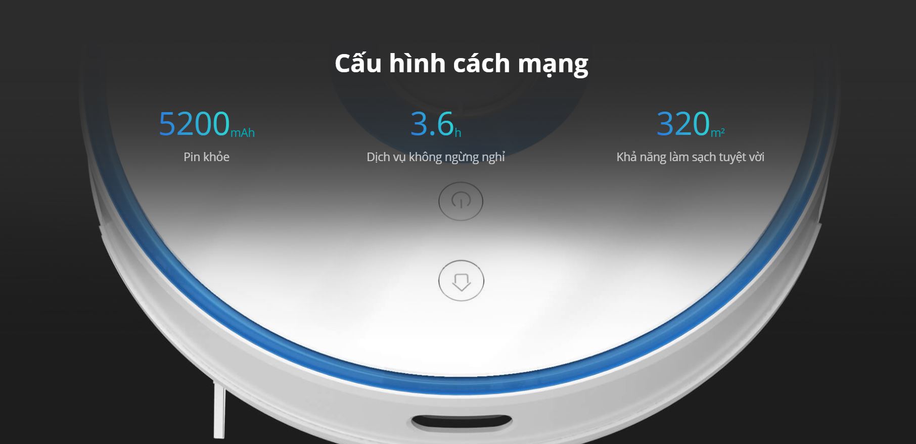 Pin 5200mAh thời gian hoạt động có thể lên đến 3.6 giờ và khả năng làm sạch không gian lớn đến 320m².