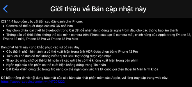Về tính năng mới, iOS 14.4 cho phép ứng dụng Camera có thể quét mã QR nhỏ hơn, phân loại các thiết bị âm thanh được ghép nối qua Bluetooth của bên thứ ba để điều chỉnh mức âm thanh của tai nghe sao cho phù hợp nhất.