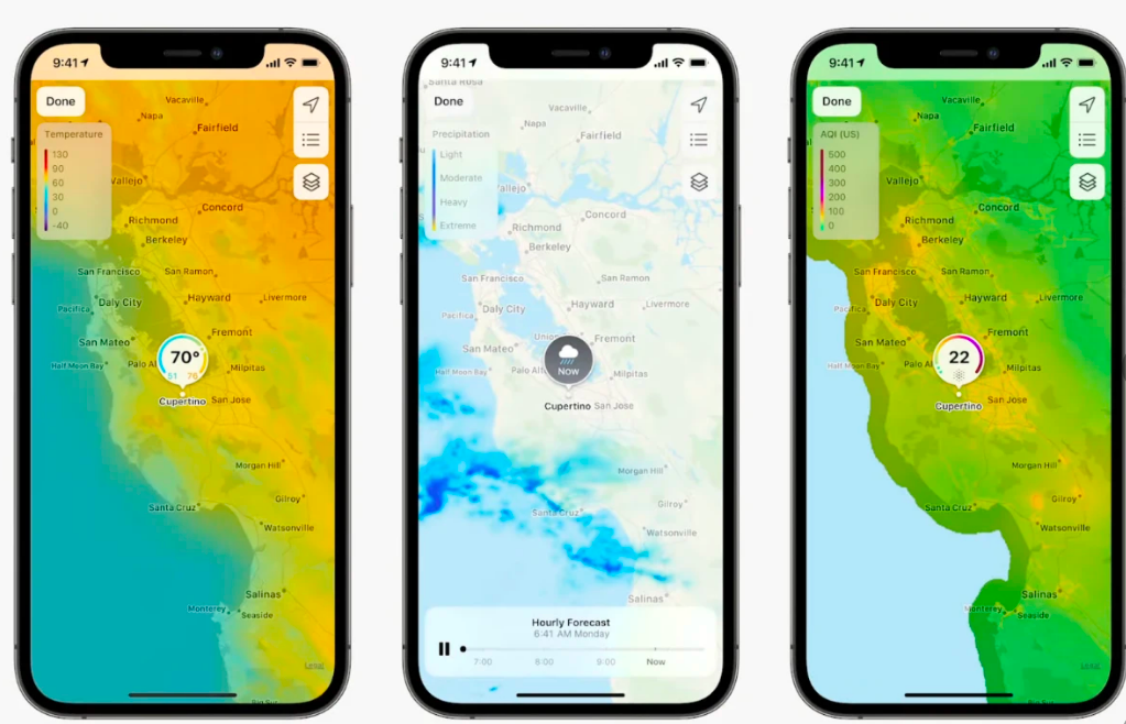 Ứng dụng Thời tiết trên iOS 15 trực quan hơn. Ảnh: Apple.