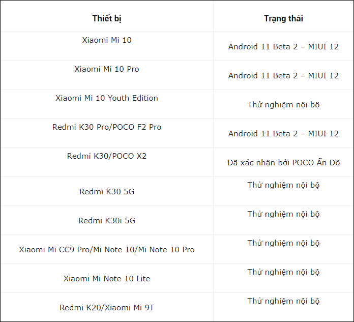 Dưới đây là danh sách smartphone hiện đang được thử nghiệm Android 11 (kể từ ngày 3/8), bao gồm các mẫu điện thoại Xiaomi, Redmi và POCO: