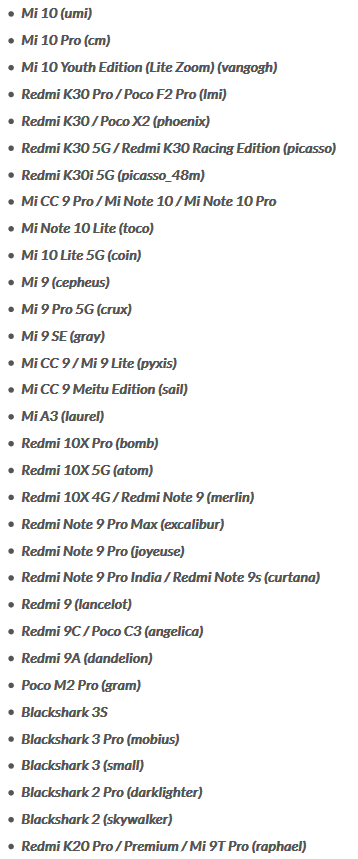 - Mi CC9 Pro / Mi Note 10 / Mi Note 10 Pro