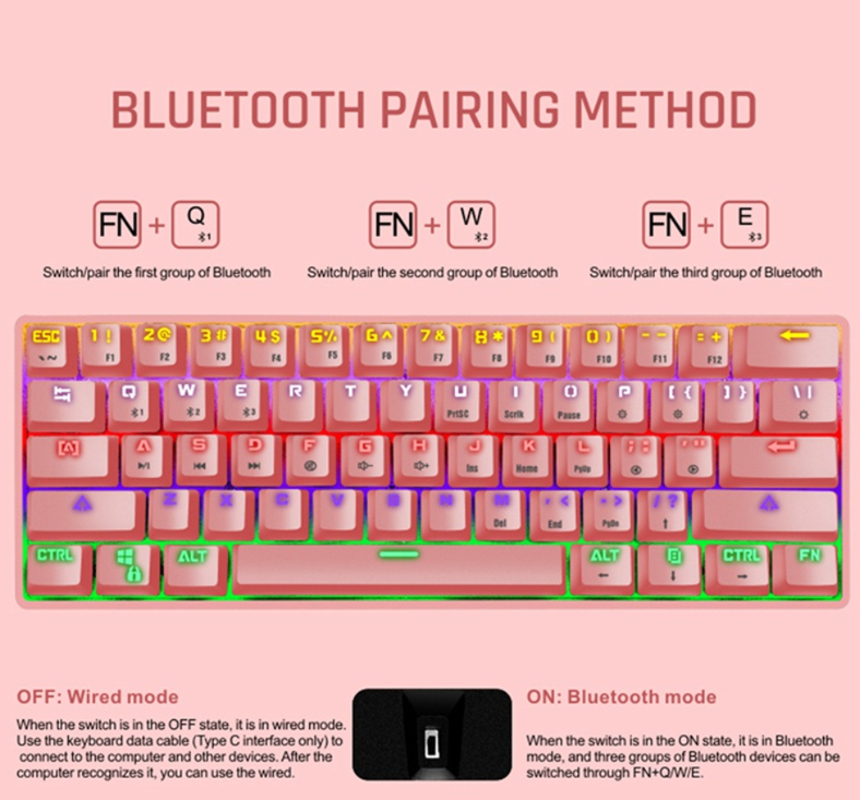 * Nhấn và giữ fn + w hơn 3 giây để mã hoá, đèn đỏ ở khoảng giữa phím WIN và phím ALT nhấp nháy với tần số 1 lần/ giây. Căn chỉnh mã thành công, đèn sẽ nhấp nháy nhanh và tắt hai lần sau đó tìm đến bluetooth và kết nối.