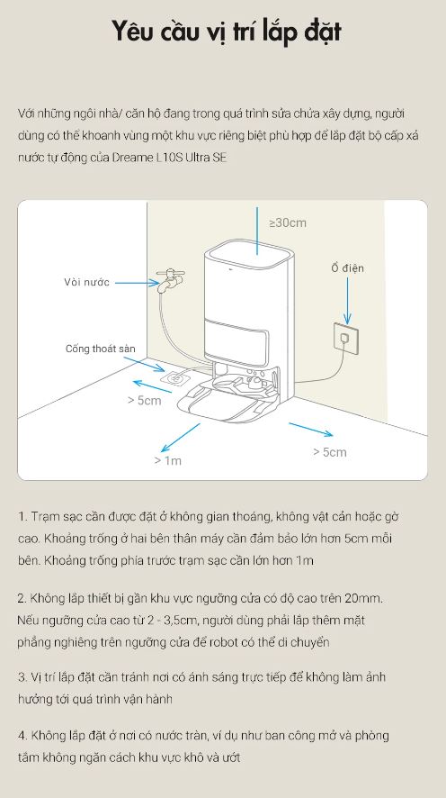 Robot hút bụi lau nhà Dreame L10S Ultra SE thuộc phân khúc thiết bị lau nhà cao cấp với trạm sạc hiện đại, thông minh, tự động làm sạch. Sản phẩm là một hệ thống làm sạch gồm hộc chứa rác, bình chứa nước sạch 2,5L và nước bẩn 2,4L. Ngoài ra thiết bị có thể kết hợp với bơm xả nước tự động (bán rời) để quy trình dọn dẹp khép kín và liền mạch hơn, không cần lo ngại tình trạng quên thay nước cho sản phẩm nữa.