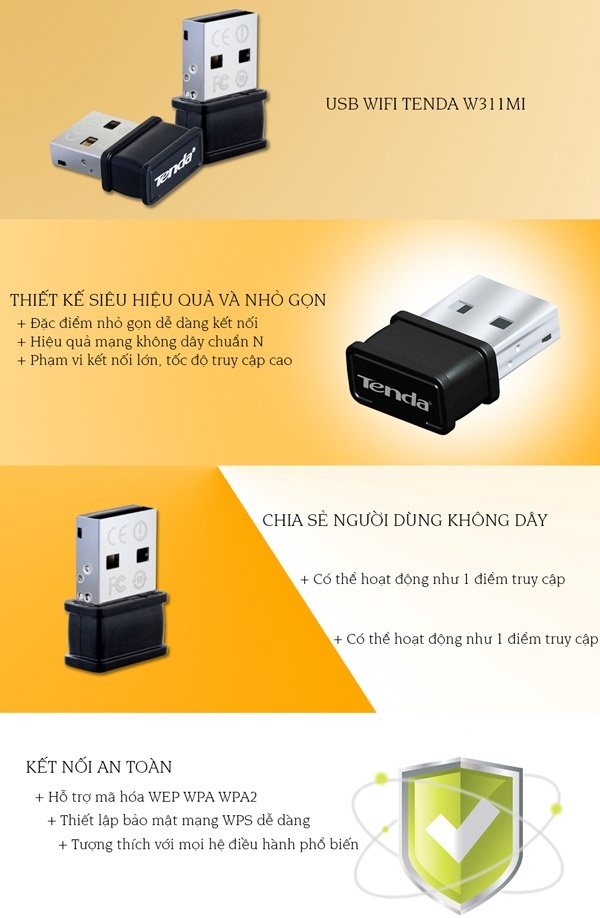 Bộ thu sóng wifi USB mini Tenda 311MI/150Mbps là thiết bị thu wifi chuẩn không dây 802.11n. Biến chiếc máy tính bàn của bạn thành một chiếc Laptop sử dụng wifi, hoặc tăng vùng kết nối, tốc độ mạng cho laptop trong điều kiện mạng kém, yếu. Bộ thu sóng wifi nhỏ gọn, tiện lợi, được nhiều gia đình tin dùng để kết nối mạng một cách đơn giản cho các em học sinh và là một vật dụng không thể thiếu khi đi công tác xa, du lịch,...