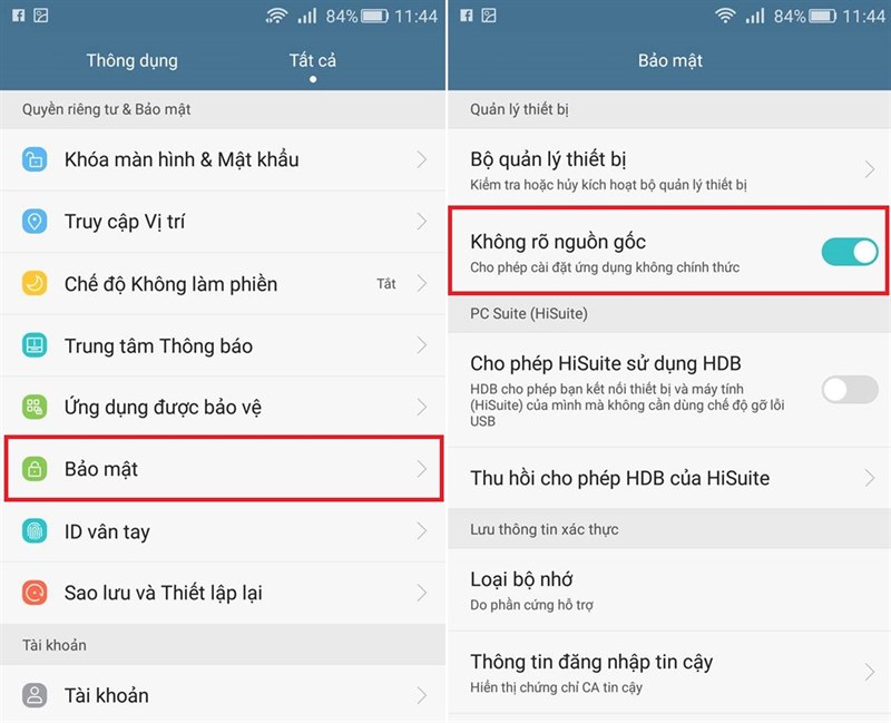 Truy cập vào Cài đặt > Bảo mật > Kích hoạt mục "Cài đặt ứng dụng không rõ nguồn gốc".