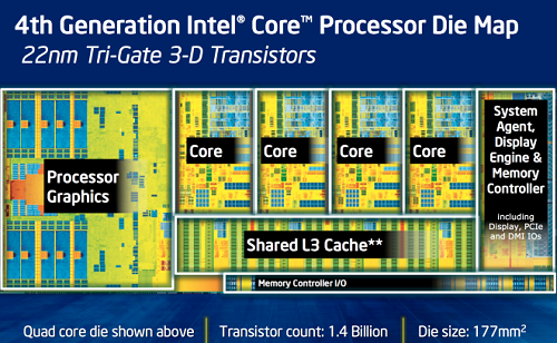 Haswell cũng được Intel tuyên bố là sẽ tiết kiệm điện năng gấp 20 lần so với Sandy Bridge ở chế độ chờ trong khi hiệu năng đồ họa cũng tăng đáng kể. Bên cạnh việc nâng cấp từ chip đồ họa Intel HD 4000, Intel còn bổ sung thêm dòng chip đồ họa mạnh mẽ Iris/ Iris Pro dành cho các chip cao cấp.