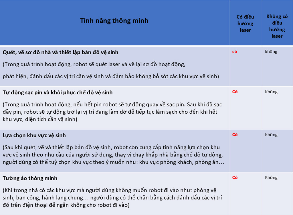 - Tính năng thông minh: Với các sản phẩm robot hút bụi trên thị trường hiện nay chủ yếu chia ra làm 2 dòng sản phẩm chính, đó là loại có trang bị hệ thống điều hướng thông minh bằng laser (có một số điều hướng Camera) tiêu biểu như: Ecovacs T5 Hero, Xiaomi Roborock S5 và loại không được trang bị hệ thống điều hướng thông minh, để hình dung sự khác biệt giữa 2 dòng sản phẩm này mời bạn tham khảo bảng so sánh dưới đây: