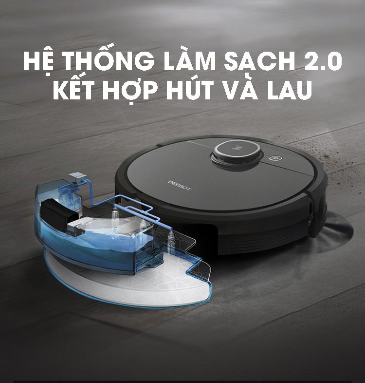 - Hệ thống làm sạch: Ngày nay, trên 1 số loại robot hút bụi còn được trang bị thêm hệ thống lau thông minh OZMO hay còn gọi là robot hút bụi lau nhà đồng thời, đây là một công nghệ lau tiên tiến nhất do hãng Ecovacs phát triển. Với hệ thống lau thông minh OZMO đem lại cho robot có khả năng làm sạch tối ưu hơn trên một số loại sàn như: sàn gạch, sàn gỗ, đồng thời khắc phục hoàn toàn các nhược điểm như: chảy tràn nước ra sàn tại các vị trí khi robot ngừng hoạt động hay không kiểm soát được độ ẩm của khăn lau (quá ướt hoặc quá khô) như trên các loại robot hút bụi của các thương hiệu khác. Nhược điểm của các loại robot hút bụi có trang bị hệ thống lau là: yêu cầu chế độ bảo dưỡng vệ sinh máy khắt khe hơn, do phải tích hợp hệ thống lau nên không gian thiết kế dành cho các bộ phận khác nhỏ hơn (ngăn đựng rác, động cơ hút), dẫn đến công suất thấp hơn so với các loại robot chuyên về quét hút và về cơ bản, hiệu quả làm sạch chủ yếu vẫn là hệ thống quét và hút của robot.