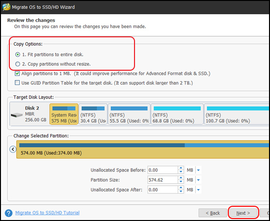 Tiếp theo, chọn sao chép kích thước hoặc tự điều chỉnh cho phân vùng của Windows > chọn Next.