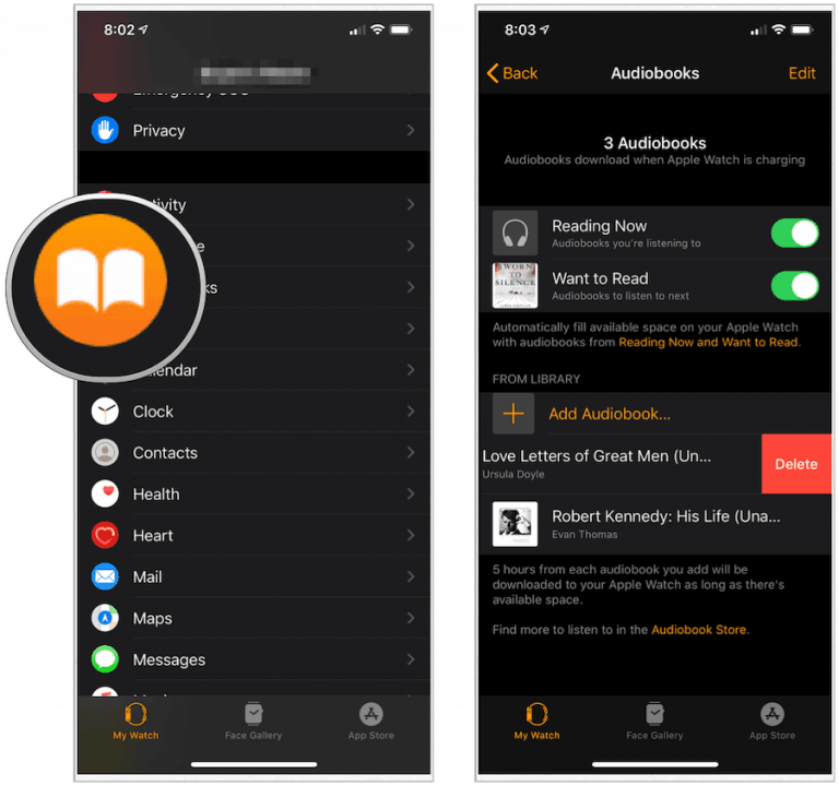 Chọn Apple Watch trên iPhone > chọn Audiobooks trong My Watch > trong From Library, cuộn từ phải sang trái > chọn Delete.