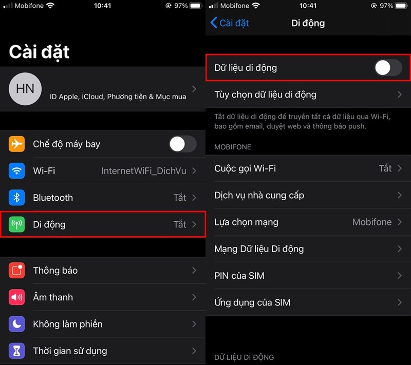 Sau khi khởi động lại máy xong, bạn vào Cài đặt > Di động > Bật lại Dữ liệu di động nhé.