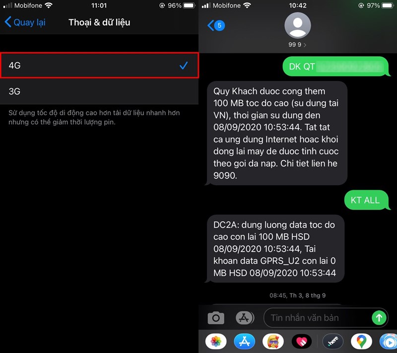 Đầu tiên, bạn cần đảm bảo điện thoại đã đăng ký sử dụng 4G thành công, vào Cài đặt > Di động > Tùy chọn mạng di động 4G. Sau đó vào Tin nhắn để kiểm tra lại tin nhắn xác nhận đăng ký gói cước từ nhà mạng.