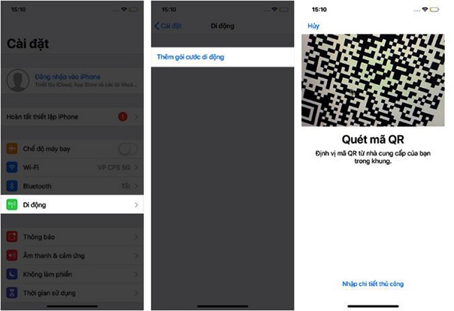 - Bước 4: Quét mã code QR của nhà mạng cung cấp bằng Camera của iPhone. Mỗi SIM sẽ có 1 mã QR khác nhau.