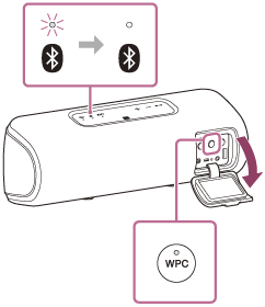 - Khi nghe thấy tiếng bíp, đèn báo (BLUETOOTH) nhấp nháy và đèn báo WPC (Wireless Party Chain) sẽ sáng lên, sau đó đèn báo (BLUETOOTH) sẽ tắt. Đèn báo WPC (Wireless Party Chain) vẫn tiếp tục sáng.