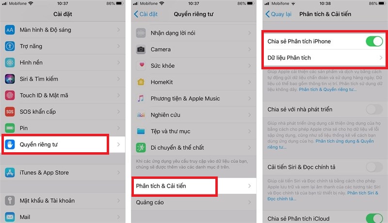 Bước 4. Tiếp tuc, bạn chọn Quyền riêng tư > Phân tích & cải tiến > Dữ liệu Phân tích. Lưu ý: Nếu chưa bật thì cần bật lên bằng cách vào Cài đặt > Quyền riêng tư > Phân tích & Cải tiến > bật Chia sẻ Phân tích iPhone và đợi ít nhất 2 ngày để Apple có thể gửi dữ liệu về máy.