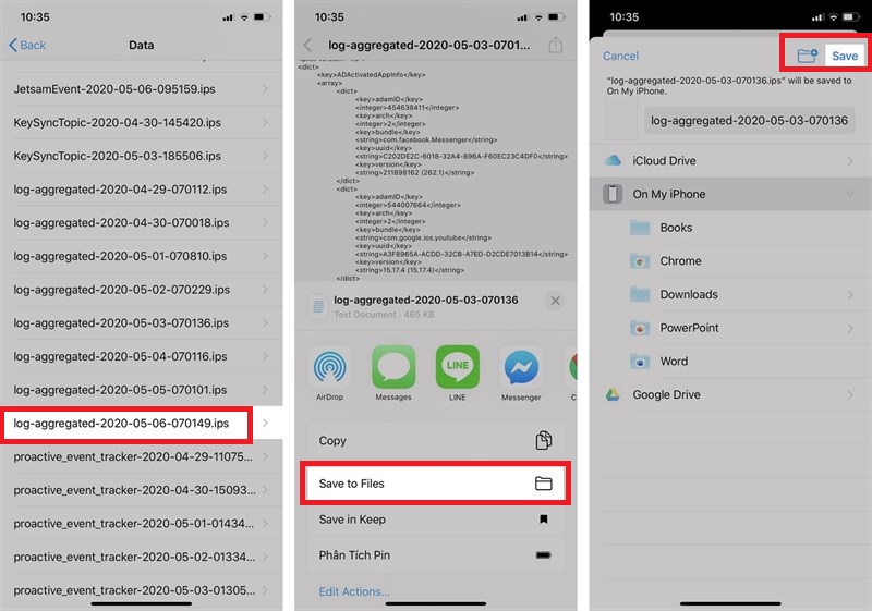 Bước 5. Trong Dữ liệu, bạn kéo và tìm mục có tên log-aggregated có thời gian mới đây nhất. Bấm nút Chia sẻ > Lưu vào Tệp (Save to Files) và nhấn Save.