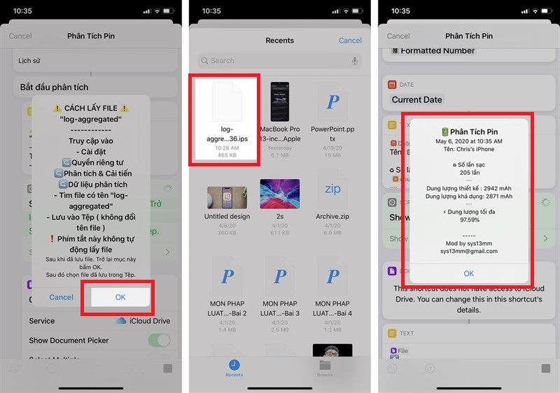 Nhấn OK. Bạn chọn File phân tích iPhone vừa lưu và để Phím tắt làm việc. Bây giờ, bạn đã có kết quả rõ ràng về báo cáo Pin iPhone của mình rồi đấy.