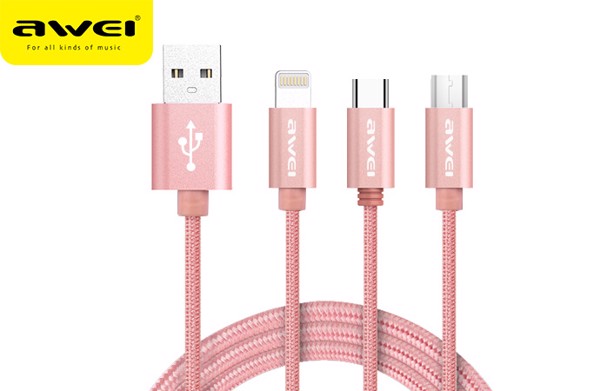 Cáp ĐTDĐ Awei đa năng 3 đầu CL-970 là dòng cáp sạc nhanh đồng thời có chức năng truyền dữ liệu tốc cao hỗ trợ USB 2.0. Không chỉ là thiết bị công nghệ nhàm chán, với thiết kế nhiều màu sắc thời trang và khả năng tương thích với nhiều thiết bị phổ thông, đây là một sản phẩm đáng để bạn lựa chọn. Cáp tương thích với tất cả các thiết bị dùng cổng micro USB, Lightning và USB-C
