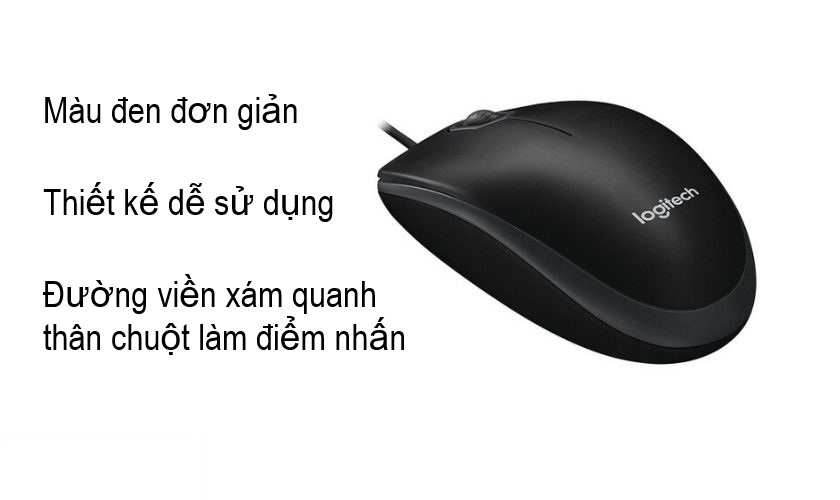 Chuột có dây Logitech B100 có thiết kế rất đơn giản với tông màu đen với một số chi tiết có màu xám làm điểm nhấn như phần viền xung quanh thân chuột và logo của Logitech. Thiết bị được thiết kế để thuận tiện cho cả người thuận tay trái và tay phải sử dụng, kích thước tổng thể khá nhỏ gọn dài 8cm - ngang 4,5cm - cao 4cm cùng với đó là khối lượng khá nhẹ chỉ 80g.
