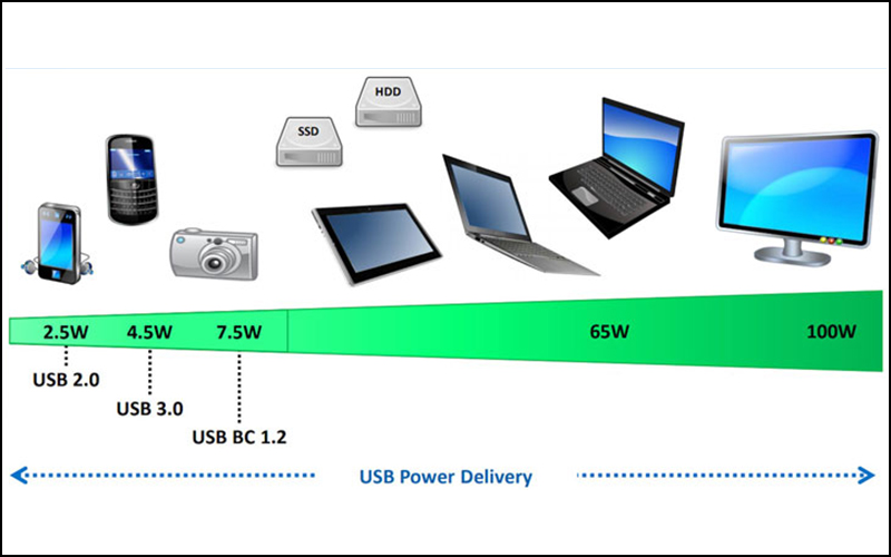 - Với công suất lớn hơn 15W, USB Power Delivery 3.0 sẽ có mức điện áp 5 và 9V.