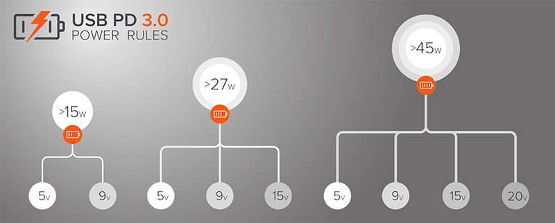 USB Power Delivery hiện nay chúng ta sử dụng được gọi là chuẩn Power Delivery 3.0, bao gồm những quy tắc điện áp và dòng điện cho thiết bị - Power Rule.