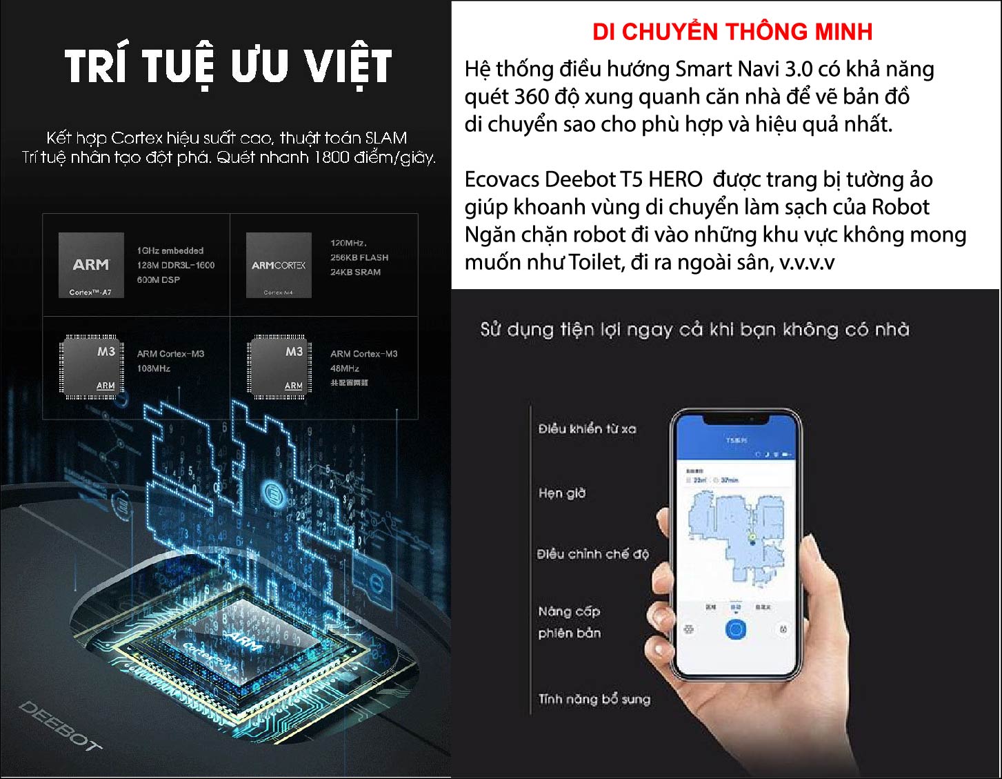 - Cơ chế hoạt động của T5 HERO dựa trên thuật toán SLAM, tăng cường khả năng định vị kết hợp trí tuệ nhân tạo đột phá. Thiết bị sử dụng chip xử lý Cortex hiệu quả cao, giúp quét nhanh khung hình 1800 điểm/giây, tái hiện rõ nét và nhanh chóng không gian gia đình bạn nhờ cục laser gắn trên thân máy. Điều này cho phép robot vẽ bản đồ trực quan ngôi nhà, từ đó thiết lập được đường đi thông minh, nhanh chóng, tiết kiệm năng lượng và thời gian dọn dẹp tối đa.