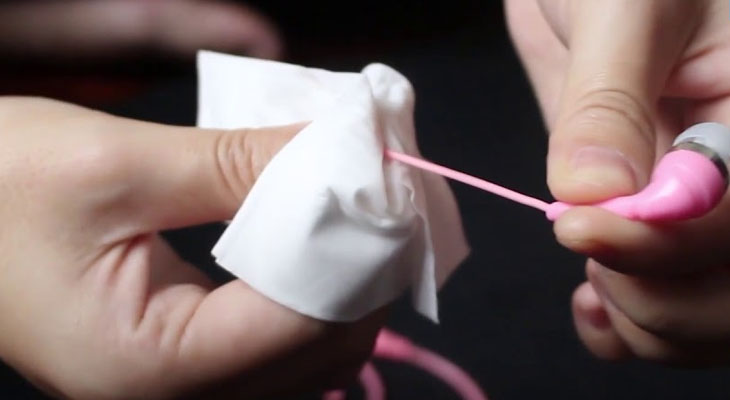 - Bước 3: Thấm một ít cồn vào miếng khăn giấy và lau dây tai nghe.