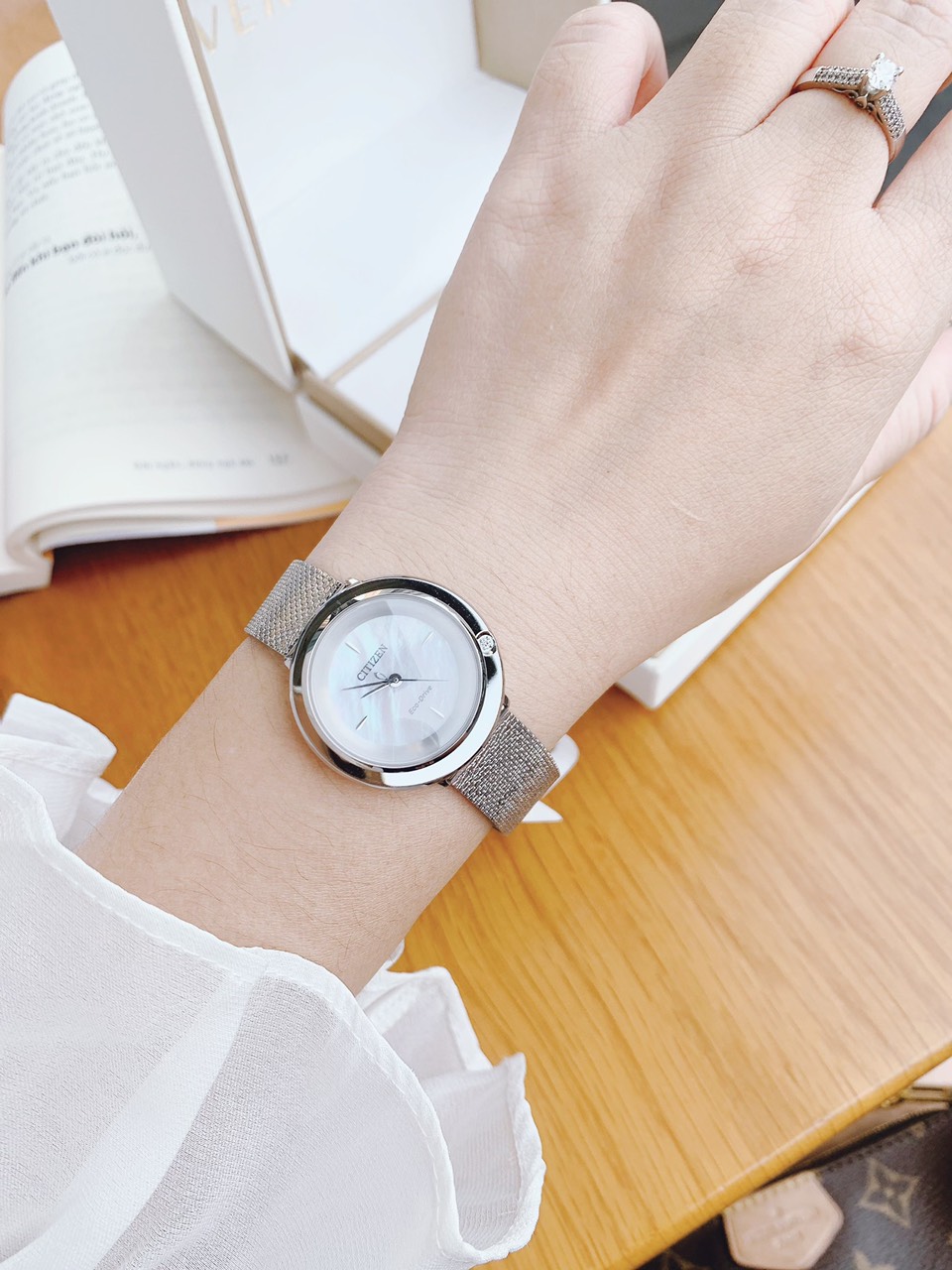 Dây đhồ bằng lưới thép không gỉ thanh lịch nổi bật với một điểm nhấn kim cương táo bạo nhưng tinh tế trên vỏ. Với công nghệ Eco-Drive - được cung cấp bởi ánh sáng, bất kỳ ánh sáng nào. Không cần pin.