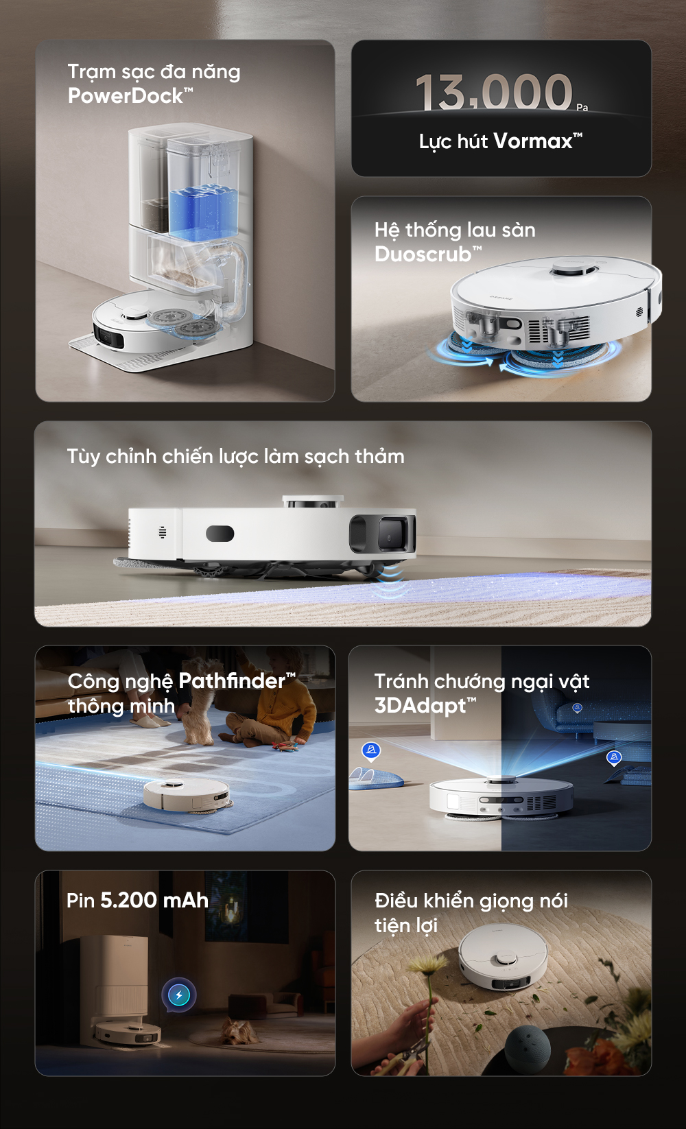 Lực hút Vormax™ mạnh mẽ 13.000Pa: Xử lý mọi vết bẩn cứng đầu và các mảnh vụn mắc kẹt trong góc.