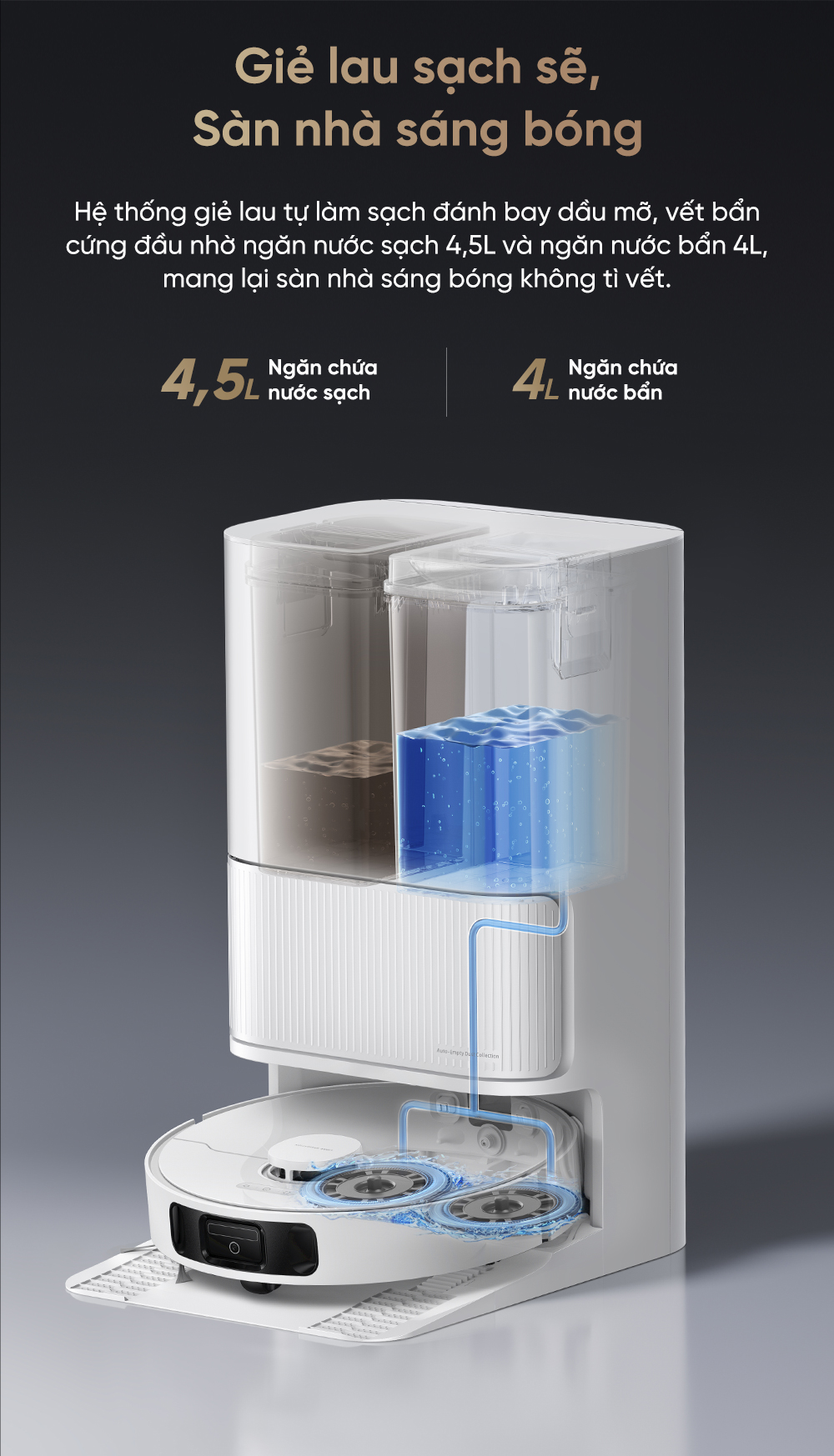 Lau dọn thảm thông minh: Cảm biến sóng siêu âm nhân diện thảm, giẻ lau tự nâng lên 10,5mm ngăn thảm bị ướt.