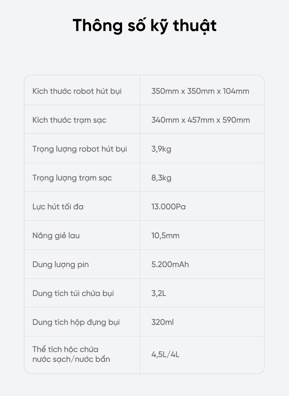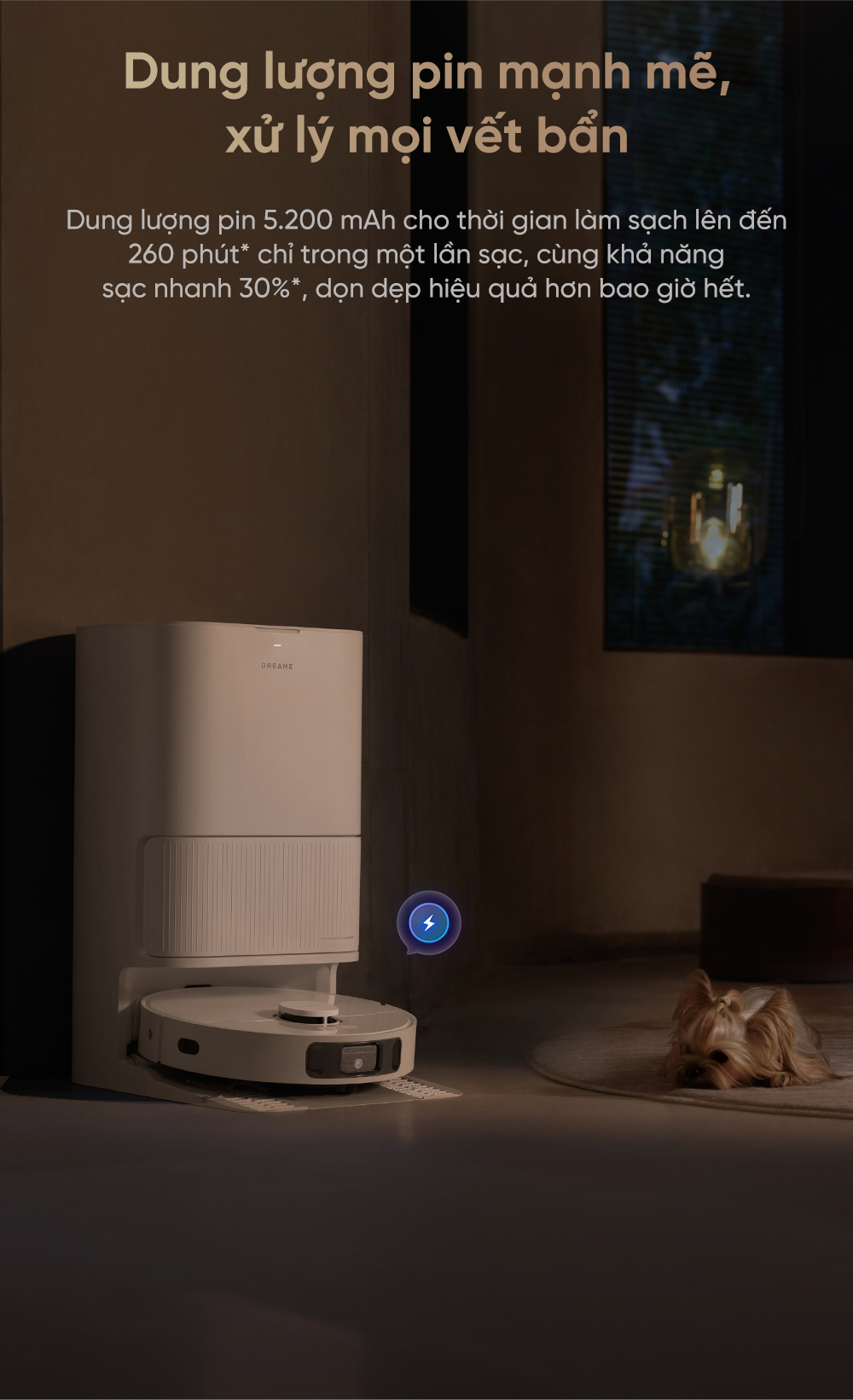 Bộ pin 5.200mAh + Sạc nhanh 30%: Dung lượng pin 5.200 mAh cho thời gian làm sạch lên đến 260 phút* chỉ với một lần sạc. Sạc nhanh hơn 30% giúp tối ưu hóa thời gian.