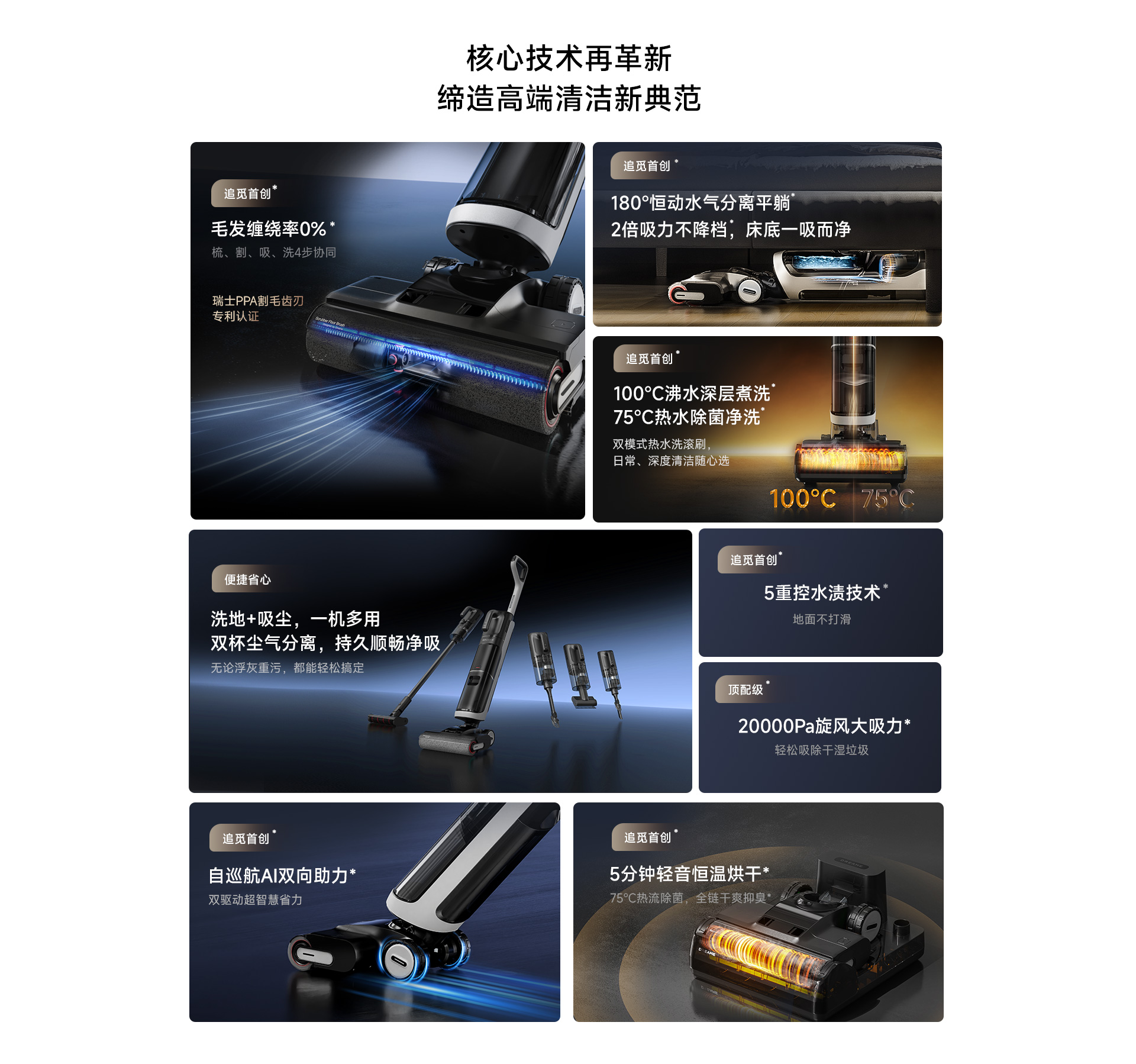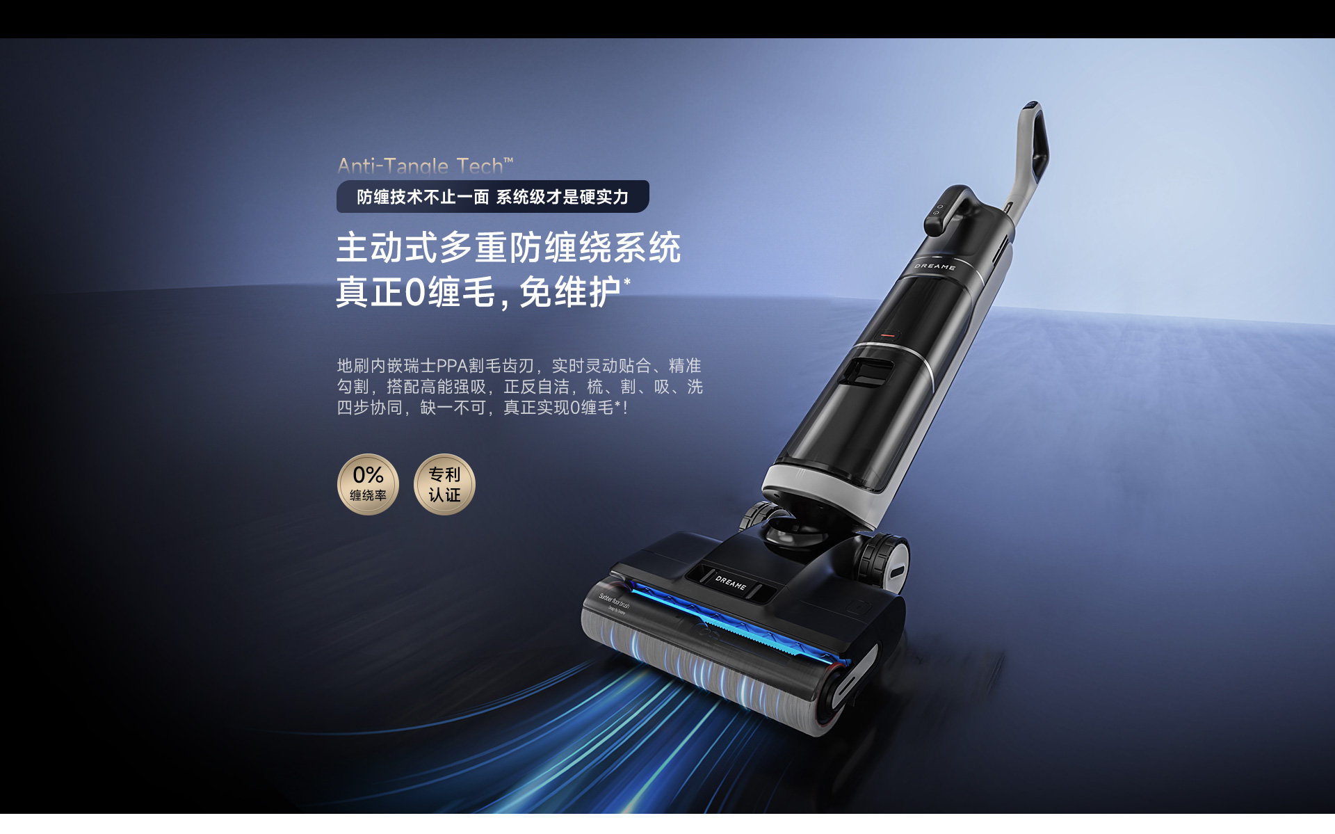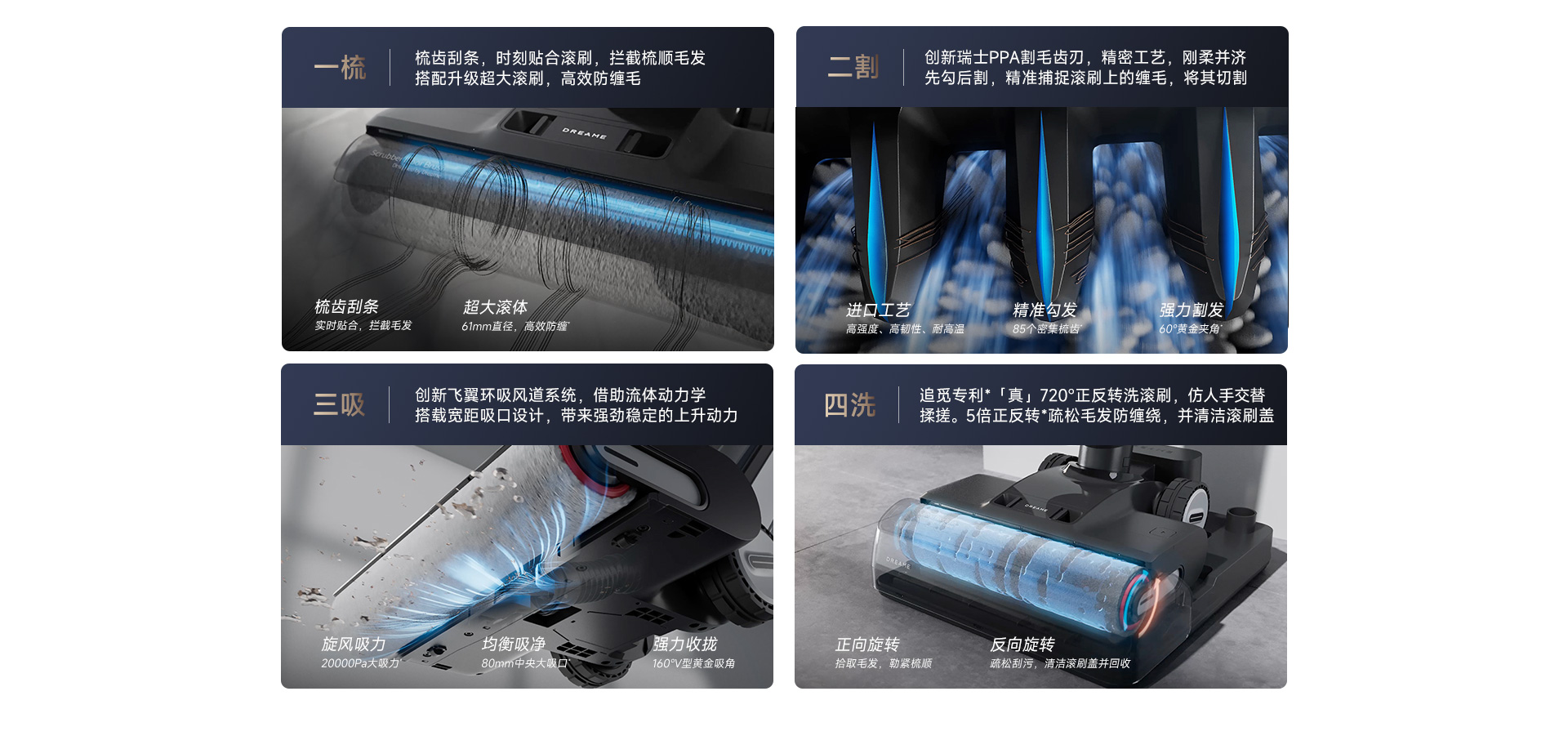 - Hệ thống chống rối chủ động, kết hợp chải, cắt, hút và rửa.