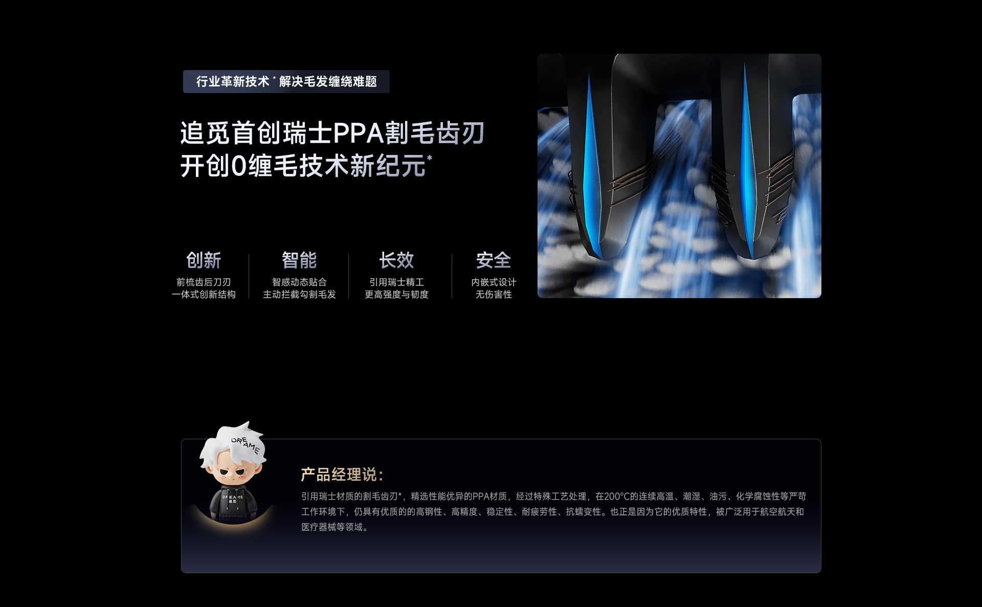 - Không còn tóc rối: Lưỡi dao cắt tóc được sản xuất tại Thụy Sĩ với chất liệu PPA cao cấp, kết hợp cùng hệ thống chống rối chủ động, giúp loại bỏ hoàn toàn tóc rối mà không cần vệ sinh.