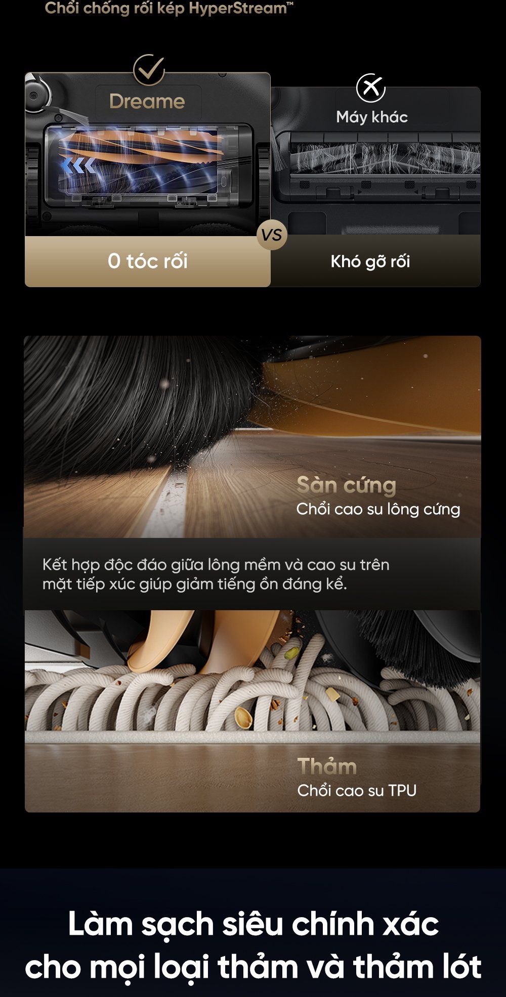 Dreame L40s Ultra được trang bị chổi chống rối kép HyperStream™, gồm: