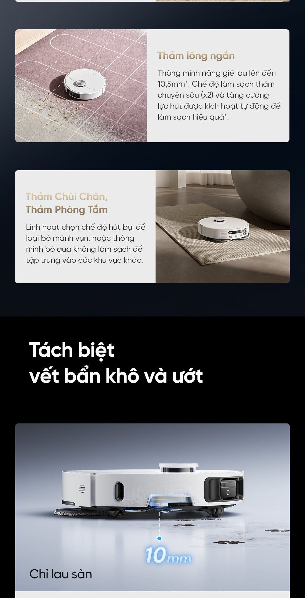 Tự động điều chỉnh lực hút và lượng nước dựa trên bề mặt (sàn gỗ, gạch, thảm).