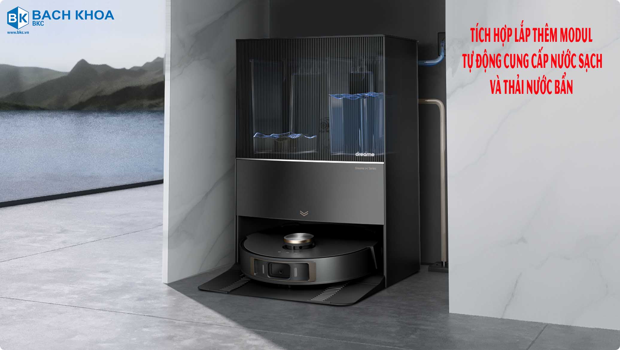 Dock sạc được tích hợp ngăn chứa nước lau sàn dung tích lớn, sẽ tự động pha dung dịch với nước sạch theo tỉ lệ thông minh
