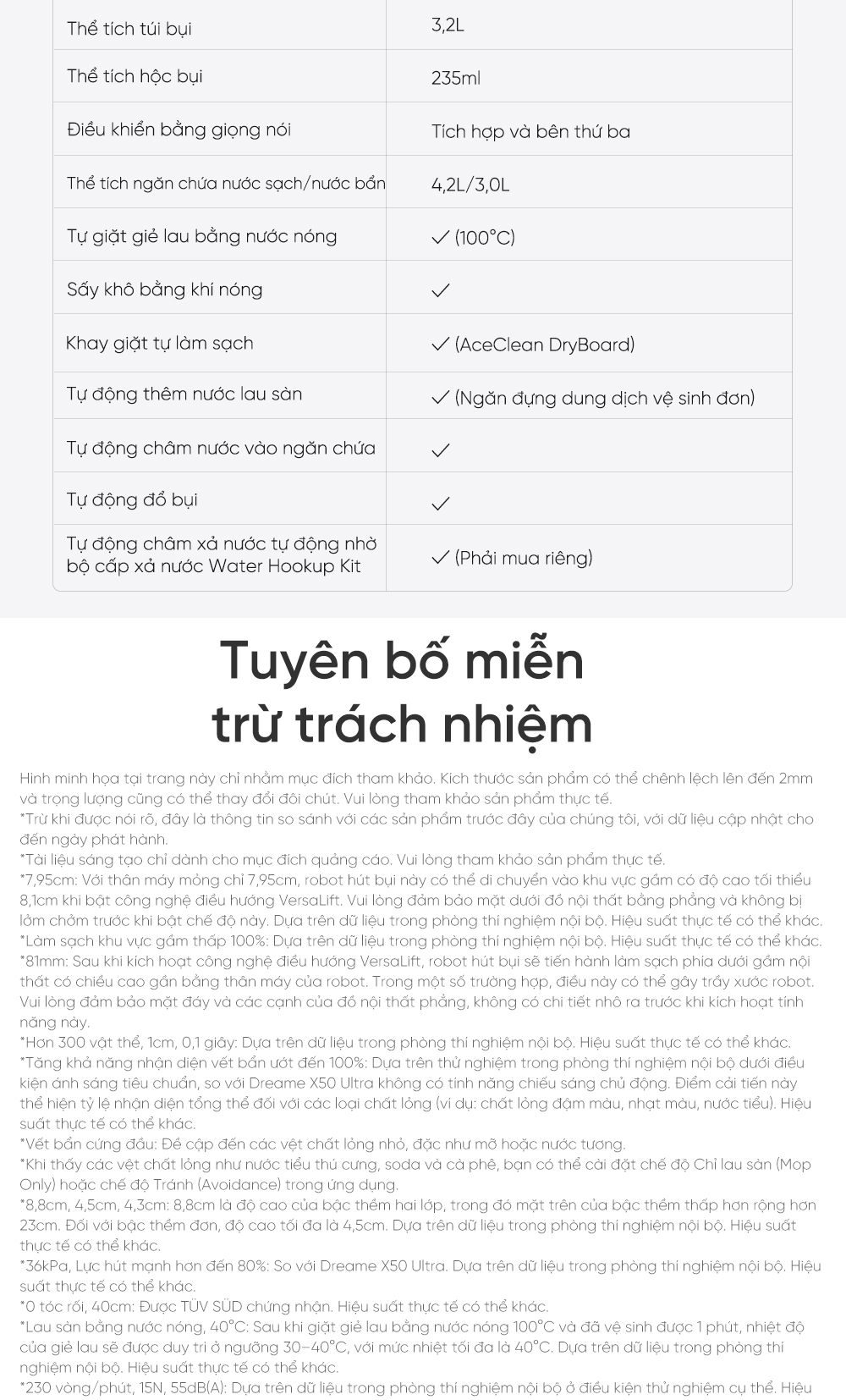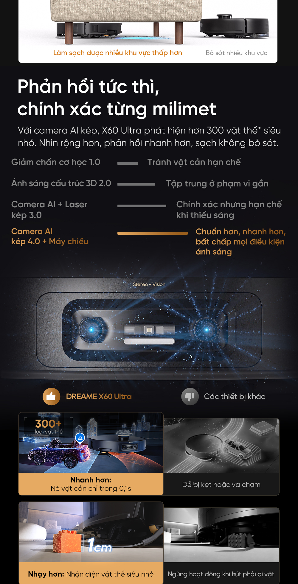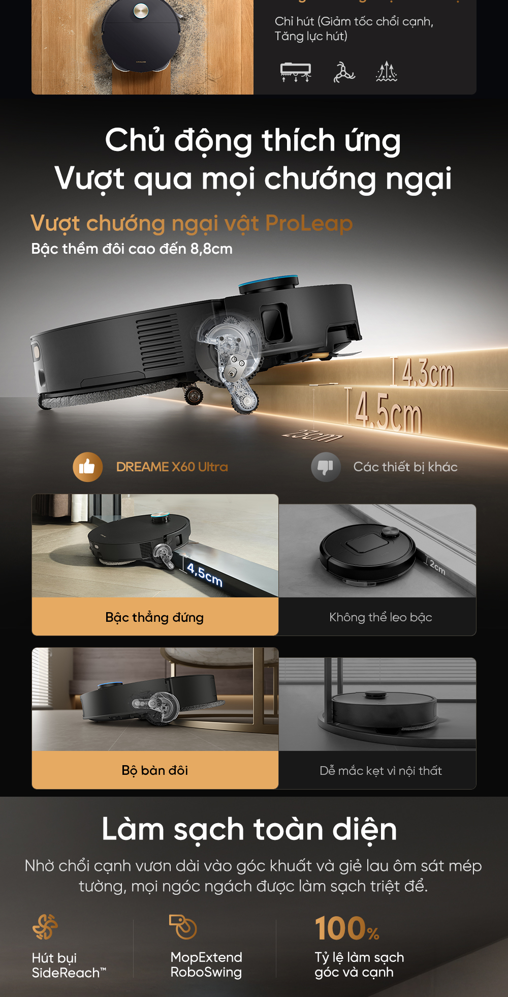 Thiết kế siêu mỏng: Chỉ 7.95cm - Cảm biến tàng hình: Trở thành một trong những mẫu robot mỏng nhất thế giới nhờ cụm cảm biến DToF tự động nâng hạ thông minh (VersaLift). X60 Ultra dễ dàng luồn lách vào những gầm giường, gầm sofa siêu thấp mà các dòng máy khác phải "chào thua".