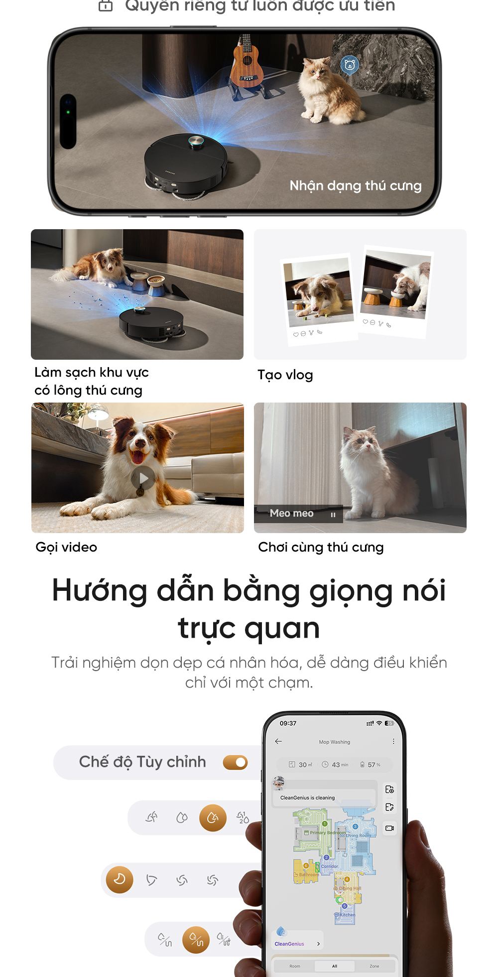 Camera AI kép góc rộng 120° & Đèn LED thông minh: "Mắt thần" nhìn thấu màn đêm. Khả năng nhận diện chính xác hàng chục loại vật cản và tự động soi sáng khu vực gầm tối. Đặc biệt, robot có thể phát hiện khu vực nhiều vết bẩn để tự động quay lại làm sạch sâu lần 2.