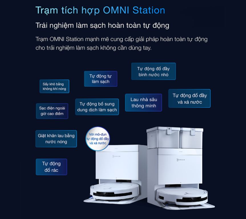 Bên cạnh đó, thiết kế trạm sạc toàn diện, mang đến khả năng giặt nóng và sấy nóng thông minh. Không chỉ vậy, Ecovacs T50 Pro Omni có thể tự động lập bản đồ ngôi nhà nhờ AIVI 3D 2.0, điều khiển bằng giọng nói qua trợ lý ảo YIKO 2.0 AI. Có thể nói, Ecovacs T50 Pro Omni xứng đáng là siêu phẩm của cuối năm nay, trở thành trợ lý của các bà nội trợ trong cuộc chiến với bụi bẩn.