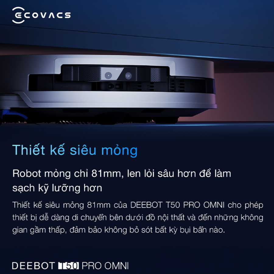 Robot hút bụi Ecovacs T50 Pro Omni có thiết kế siêu mỏng, với chiều cao chỉ 81mm, tăng khả năng di chuyển của robot, đặc biệt làm sạch kỹ lưỡng từ các khu vực phức tạp như gầm giường, gầm sofa,… Có thể nói đây là xu hướng thiết kế độc đáo, giúp trải nghiệm của người dùng trở nên tốt hơn.