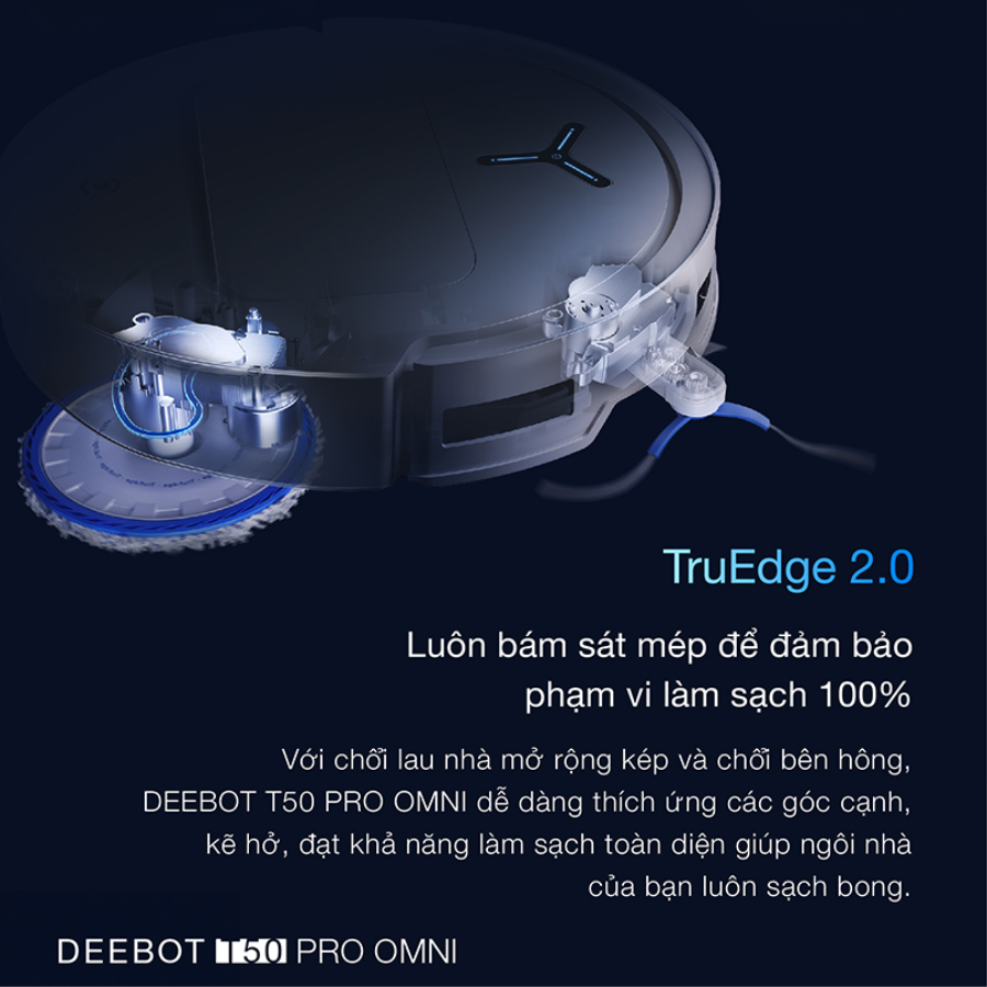 Điểm nổi bật tiếp theo của robot hút bụi lau nhà Ecovacs T50 Pro Omni chính là công nghệ làm sạch cạnh TruEdge 2.0. Nhờ đó, robot lau nhà Ecovacs T50 Pro Omni có khả năng làm sạch hiệu quả các khu vực góc cạnh, kẽ hở, những nơi mà các loại chổi thông thường khó lòng chạm đến được. Đồng thời, với thiết kế vải lau mở rộng kép giúp tăng diện tích tiếp xúc với bề mặt, đảm bảo làm sạch kỹ lưỡng cả những góc cạnh nhỏ nhất. Đây là điểm vượt trội mà chưa dòng robot hút bụi nào có thể làm được trên thị trường.