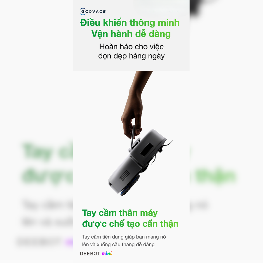 Đặc biệt, Ecovacs Deebot Mini được tích hợp tay cầm tiện lợi, cho phép người dùng dễ dàng di chuyển robot giữa các tầng trong nhà phố hoặc căn hộ có cầu thang. Với trọng lượng nhẹ, sản phẩm này mang lại sự linh hoạt tối đa, phù hợp cho mọi gia đình, đặc biệt là những không gian nhỏ gọn.