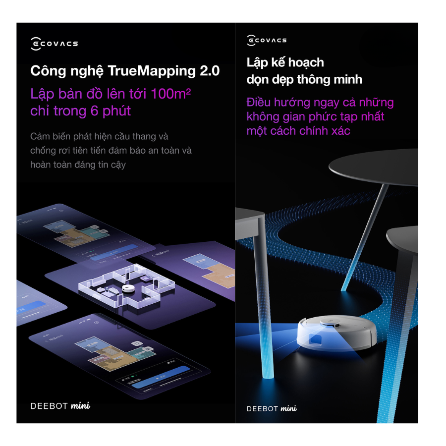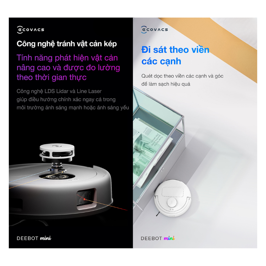 Ecovacs Deebot Mini được trang bị công nghệ TrueMapping 2.0, sử dụng radar LDS và cảm biến laser để lập bản đồ không gian 100m² chỉ trong 6 phút. Hệ thống cảm biến khoảng cách cạnh hiện đại và thuật toán AI giúp robot nhận diện vật cản với độ chính xác đến milimet, điều hướng mượt mà qua các khu vực phức tạp như dưới bàn ăn hay xung quanh đồ nội thất. Khả năng vượt chướng ngại vật lên đến 20mm giúp robot dễ dàng di chuyển qua ngưỡng cửa hoặc thảm dày mà không bị kẹt.