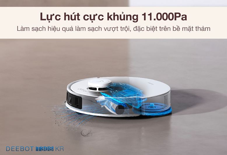 Robot hút bụi lau nhà Ecovacs Deebot T30S KR sở hữu lực hút cực mạnh lên đến 11.000Pa, giúp loại bỏ mọi loại bụi bẩn, từ những hạt bụi nhỏ nhất đến mảnh vụn lớn